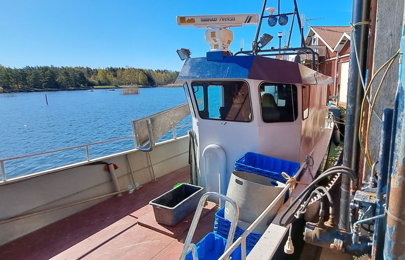 Däcket på en liten fiskebåt i fiskeläget i Spiken i Vänern.
