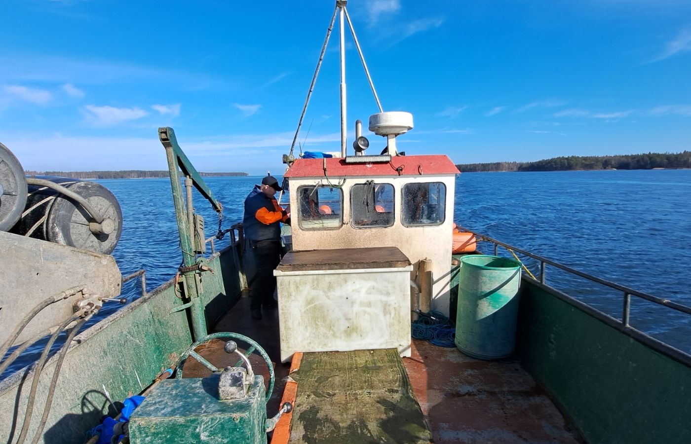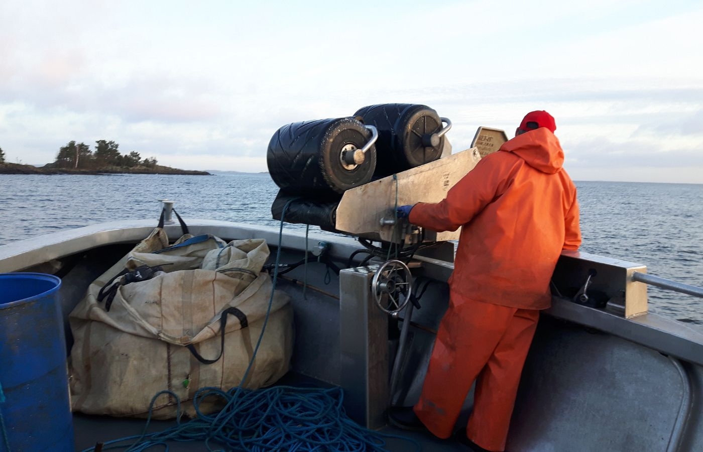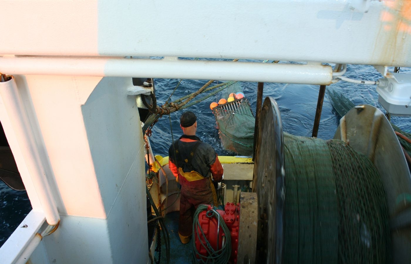 Arbetet med att hala trålen har börjat och fiskaren står redo på däck.